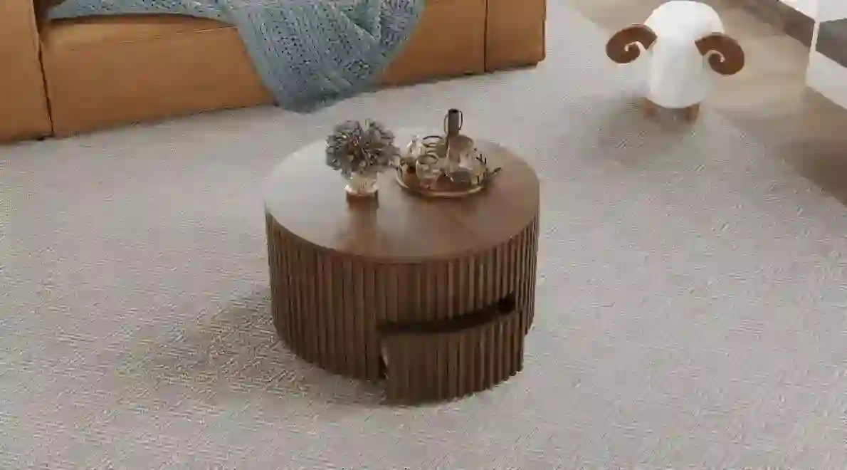 31.5'' Lifting Top Round Coffee Table, Mid-Century Modern Wood Coffee Table, Fluted Coffee Table with Hidden Storage and Drawer, Walnut Color