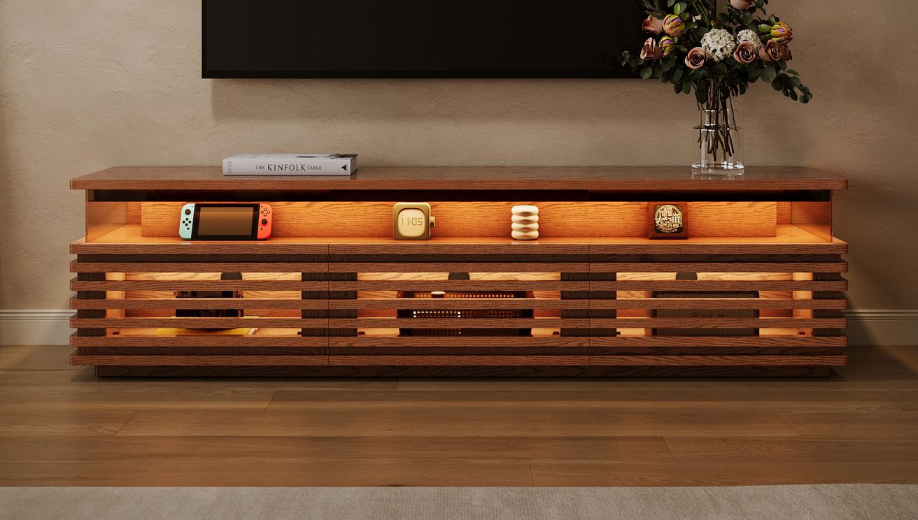 Soft LED lighting highlights your collectibles, gaming gear, or decor—transforming your TV stand into a cozy showcase.