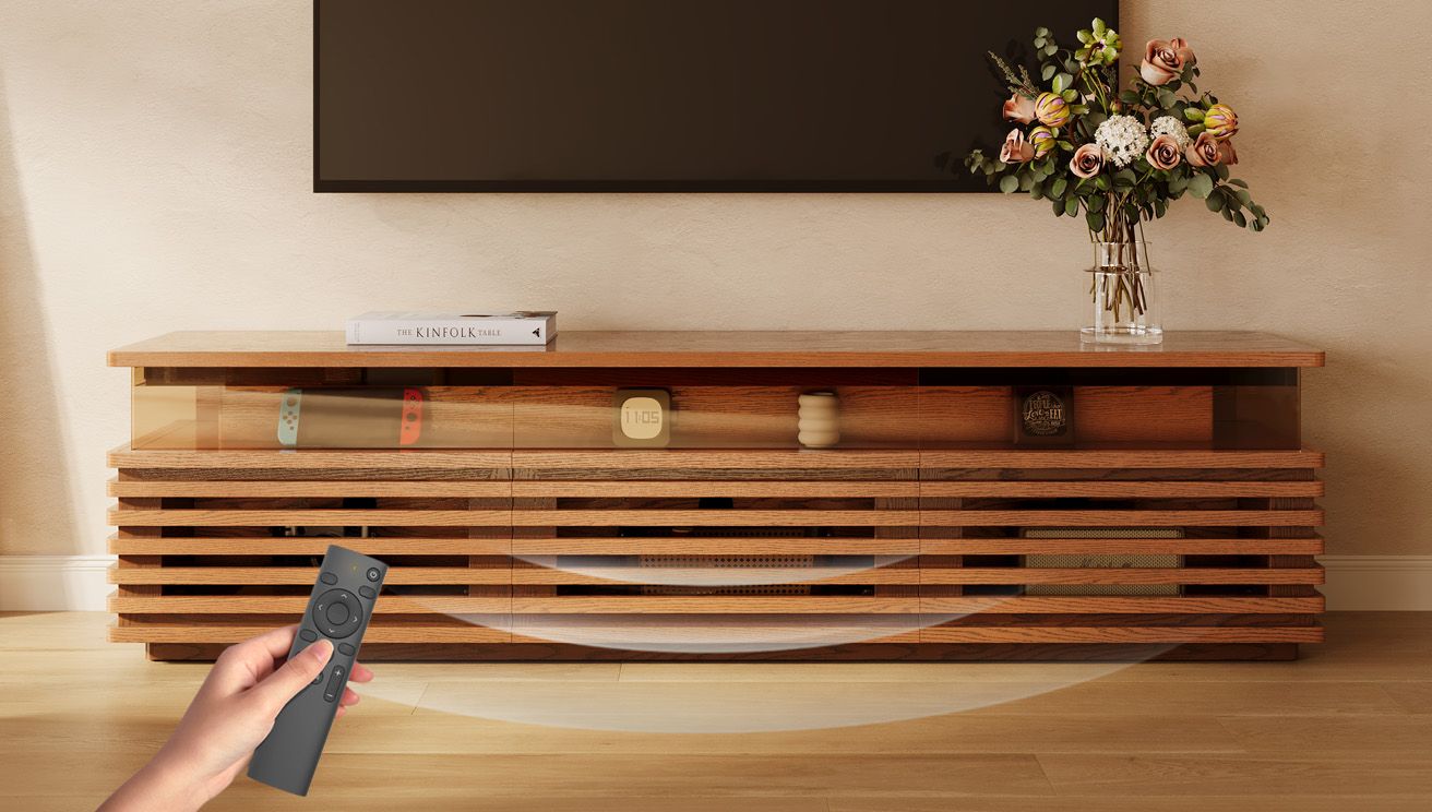 Infrared signals and audio pass freely through the slatted front—ideal for AV receivers and speakers.