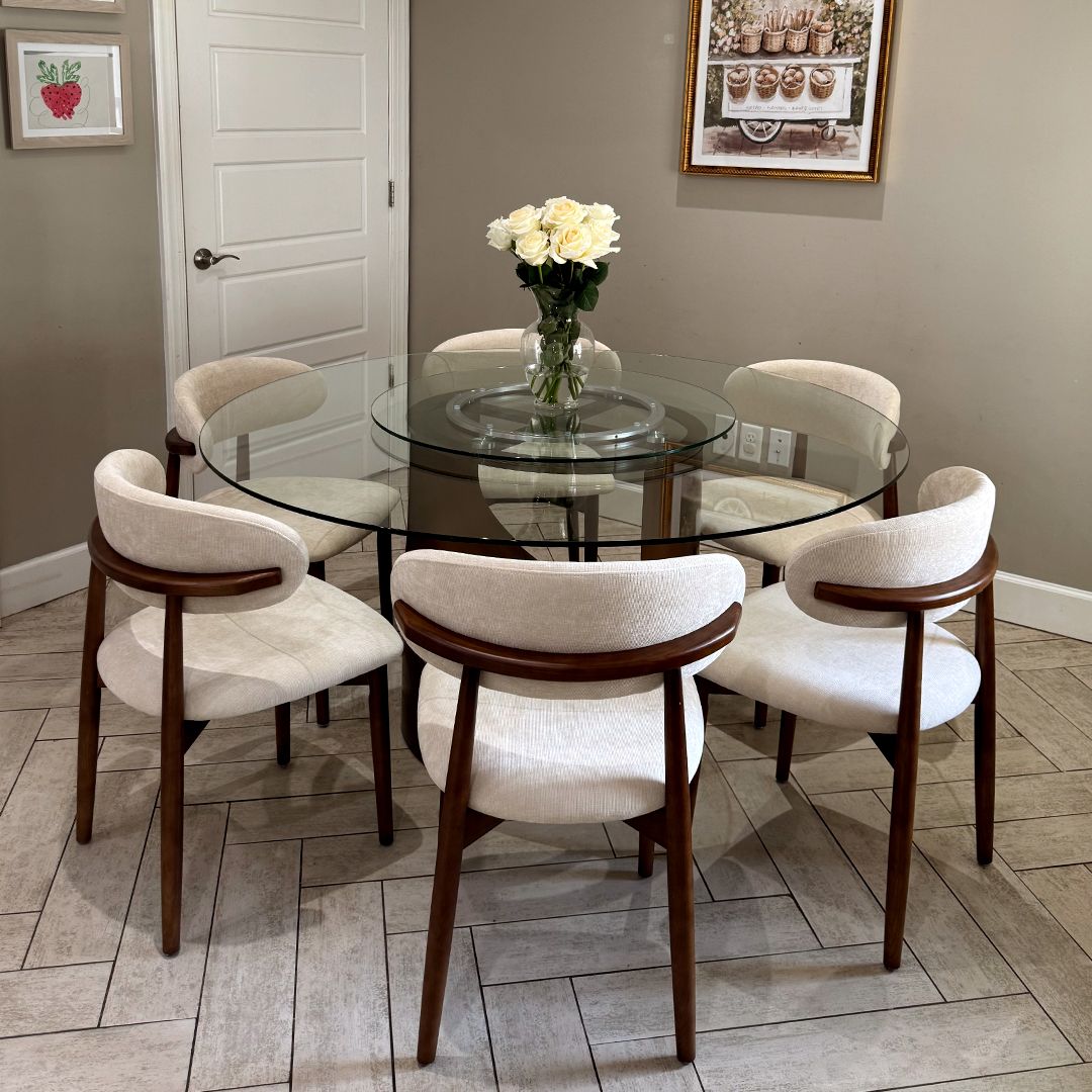 Mid Century Modern Beige & Walnut Cotton Linen Dining Chairs