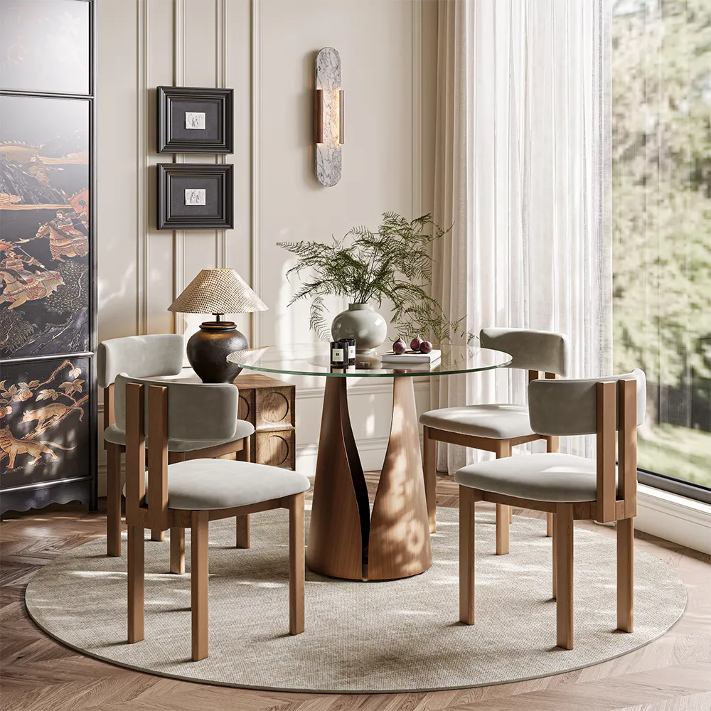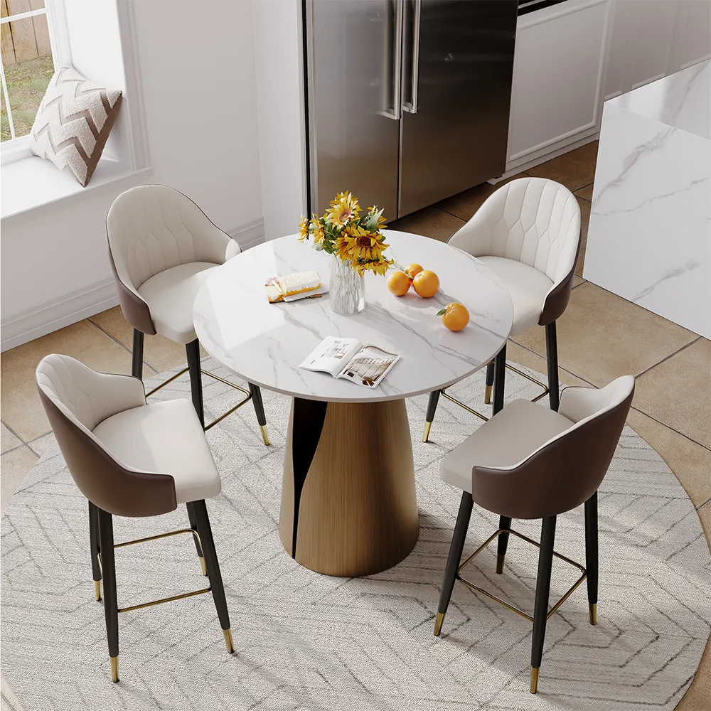 Match the finish family across the set. Coordinated sets where the table base, stool legs, and seat material come from the same finish family eliminate the “assembled-from-pieces” look that breaks open-plan layouts. POVISON’s dining table set collection is organized around full configurations, which makes the height-and-finish pairing comparison faster than browsing tables and stools separately.