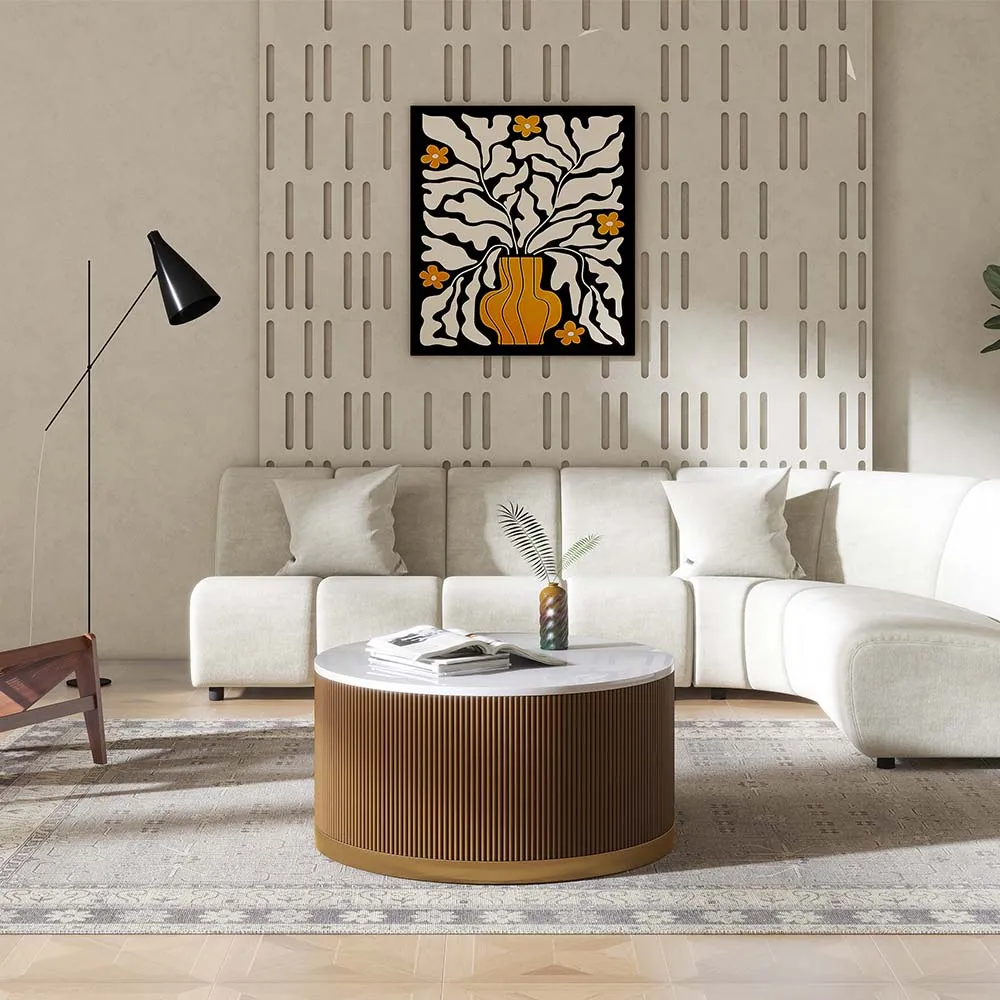 Round coffee tables are the right call for U-shaped sectionals in almost every case. With seating on three sides, every occupant needs equal access to the table edge — and a rectangle leaves the side seats reaching across awkwardly. A round table 42–48 inches in diameter solves this naturally.