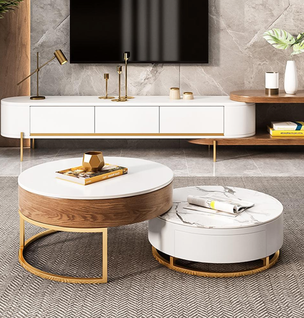 If your small living room needs the coffee table to do significant double duty as storage (toy bin, blanket stash, cable hide), a rectangular table with drawers usually wins. If your storage is handled elsewhere — built-ins, ottoman, console table — round becomes the better pick.