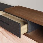 Looks even better in person. Stand was easy to assemble and arrived quickly. Love the contrasting colors. This piece has an ability to fit your space. Long , sleek and low. It has great additional storage, and fits a very large scale TV with plenty of extra surface area to spare. The quality is impeccable and would definitely recommend!