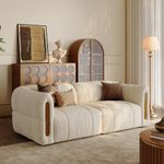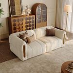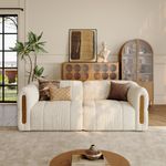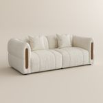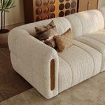 Textured boucle wraps every upholstered surface for cloud-soft warmth. Solid wood armrest inlays add cozy contrast and a subtle vintage touch.