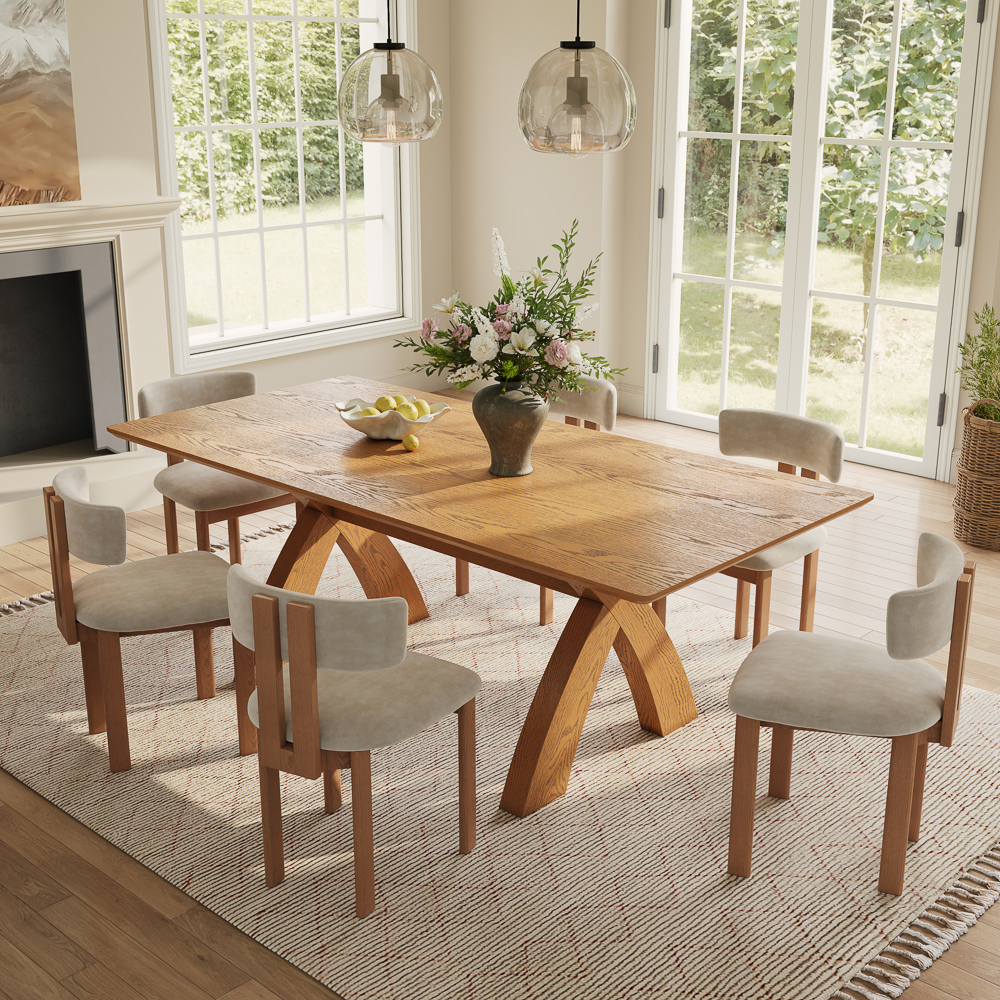 Walnut ranks among the finest furniture hardwoods with a Janka hardness rating of 1010, making it highly resistant to dents and scratches. Its naturally rich brown color with creamy sapwood streaks creates unique grain patterns in every walnut dining table. The wood darkens beautifully over time, developing deeper character. Walnut's strength-to-weight ratio also makes it ideal for elegant, thinner tabletop profiles.