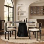 This Dining Room table and chairs set is stunning, very happy with the aesthetic and quality. Shipping took a few weeks but it was well worth the wait! I’d highly recommend purchasing it.