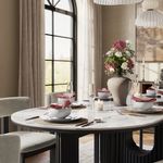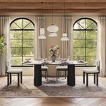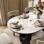 Just received this dining table set from Povison, and I'm blown away! The white quartz tabletop is super durable and a breeze to clean—no worries about spills or scratches. The wooden base gives it a rustic yet modern vibe that fits right into my space. The oval shape is perfect for my medium-sized dining area; it doesn't feel cramped and seats six comfortably with those cozy beige-cushioned chairs. Setting it up was straightforward, though the instructions could be clearer (had to watch a YouTube video, lol). But once assembled, it looked exactly like the product photos—elegant and inviting. I added a vase with some greens and a candle tray, and now it's the heart of my home for meals and gatherings. The price was totally reasonable for the quality; feels like it'll last for years. If you're on the fence, go for it—you won't regret it!
