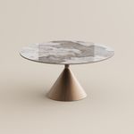 This piece pairs a sculptural bronze foundation with the clean-lined elegance of a sintered stone tabletop to create a truly elegant and modern design.