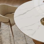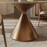 This piece pairs a sculptural bronze foundation with the clean-lined elegance of a sintered stone tabletop to create a truly elegant and modern design.