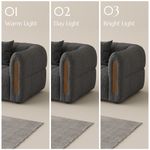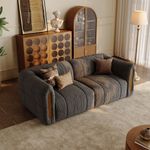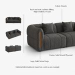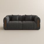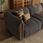 Textured boucle wraps every upholstered surface for cloud-soft warmth. Solid wood armrest inlays add cozy contrast and a subtle vintage touch.