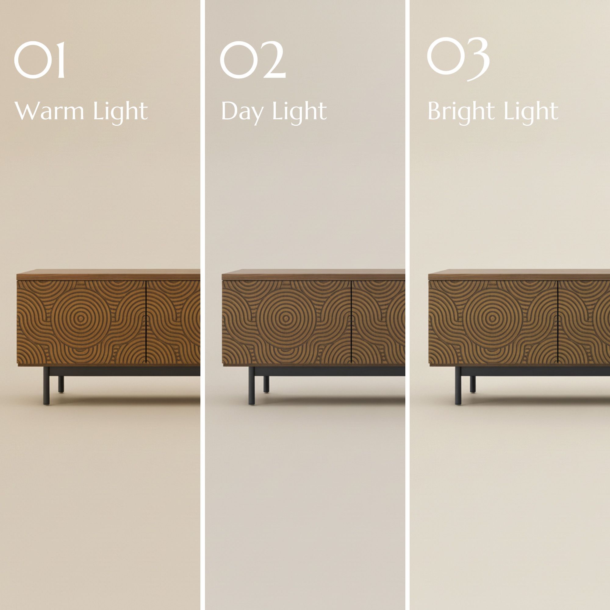Love the mid-century design of this TV stand! The circular engraved pattern adds a nice touch. Assembly was a breeze and the adjustable shelves are perfect for storing my electronics.