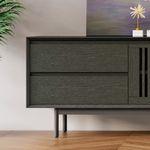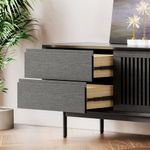 I am in love with this TV unit! Not only it was very easy to assemble but it also came well-packed. The wood is solid hardwood and it has a very sturdy base so need to worry if you have a lot of stuff to put in it. For the colour, the drawers are a bit of a charcoal grey, not black. Overall, this TV unit is ticks all my requirements - spacious, stylish and sturdy!