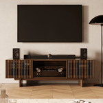 71" Walnut Media Console with Slatted Doors, Ash Veneer TV Sideboard, Remote-Friendly Media Cabinet, Wood Slat Entertainment Center, 70 inch TV Console, Professional Cable Routing, Robot Vacuum Friendly TV Stand