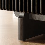 The wood finish is beautiful in person, with a warmth and depth that photos don’t fully capture, and the slatted design adds a lot of visual interest without making the piece feel too busy or overwhelming in the room.